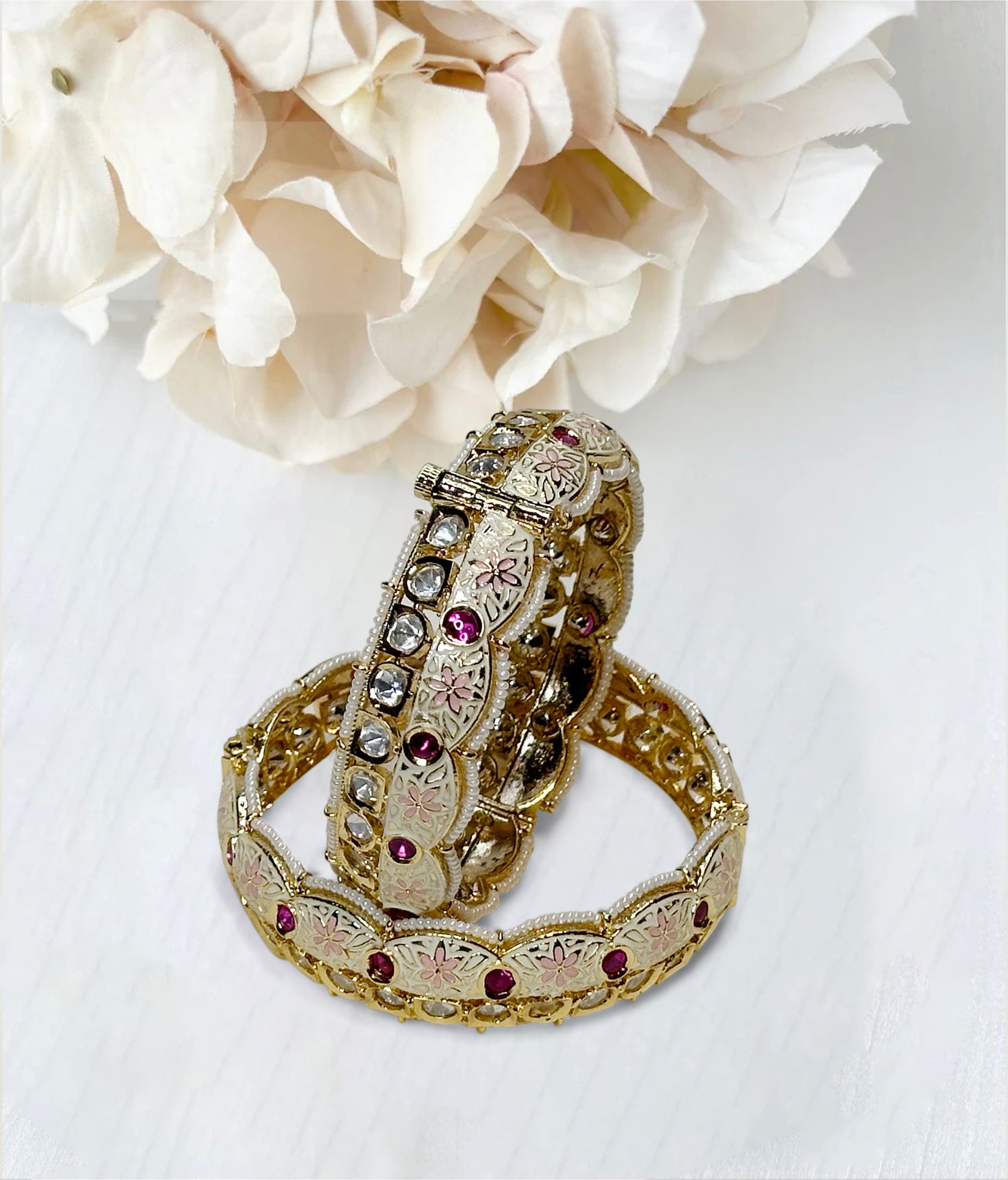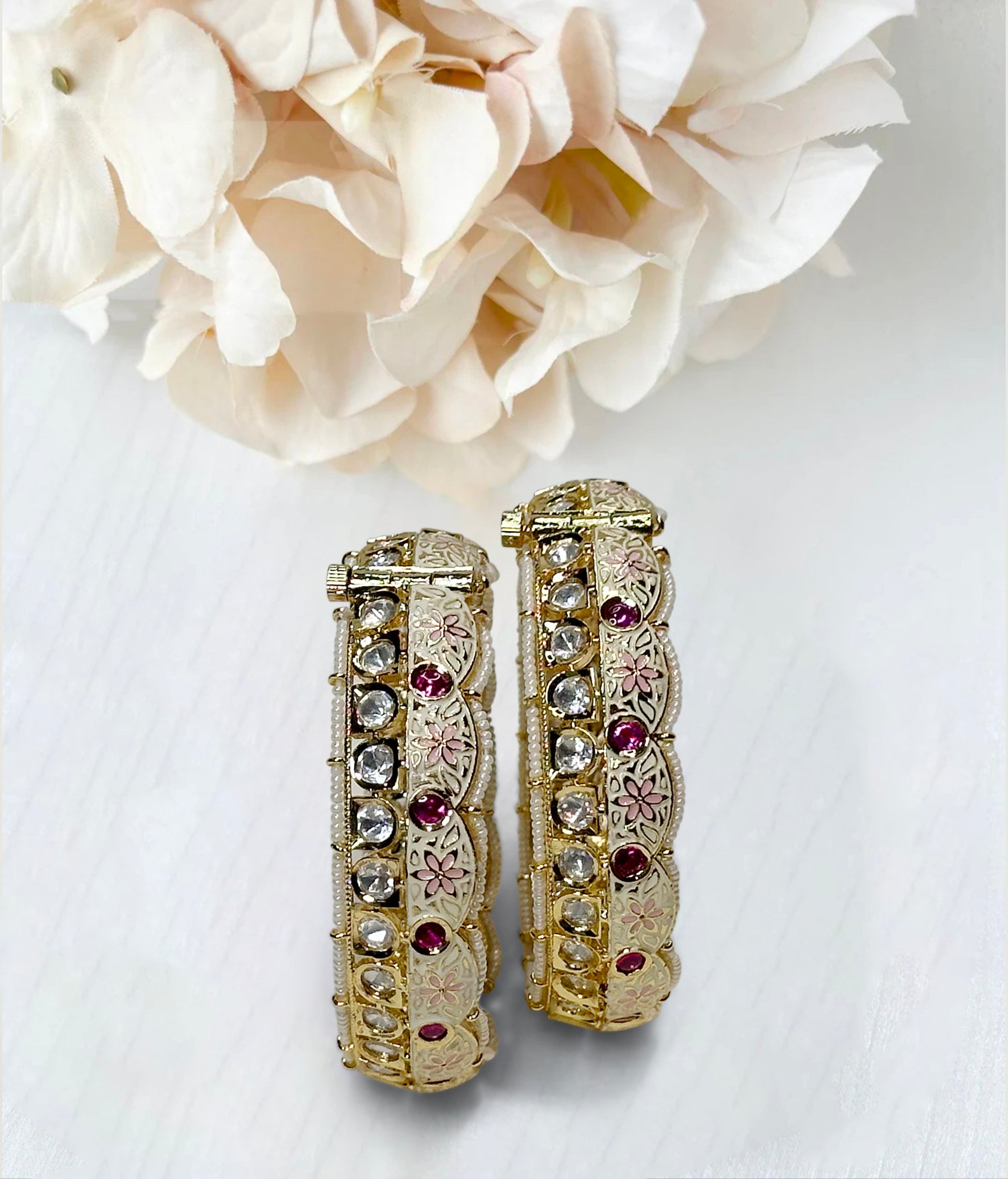 An exquisite gold plated pachi kundan kangan. These beautifully designed kangan feature intricate design of meenkari patterns with ruby stones with screw enclosure. Can be worn alone or with a bangle stack.