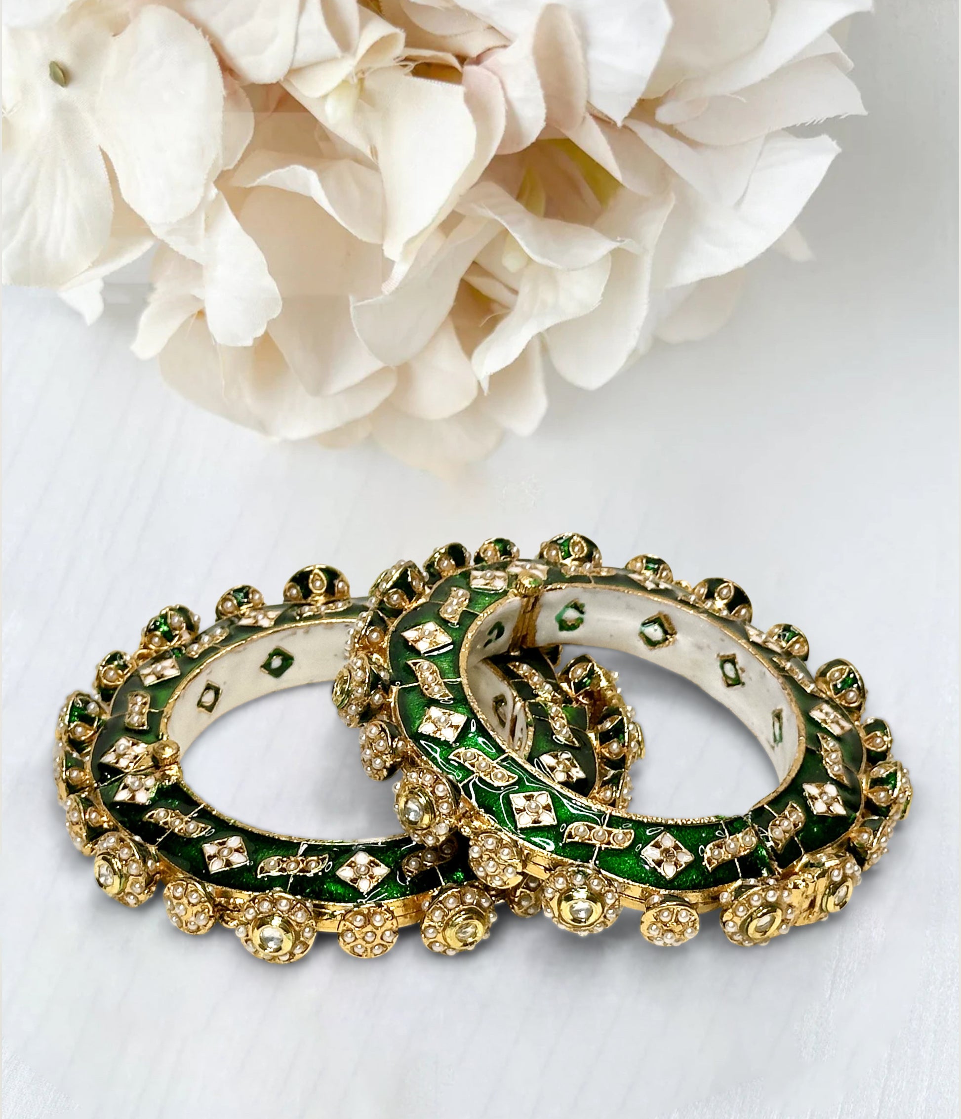 Rajwadi statement kangan, a beautiful color of deep emerald with pachi kundan flowers adorning the kangan. Hand painted in the inside with screw enclosure.