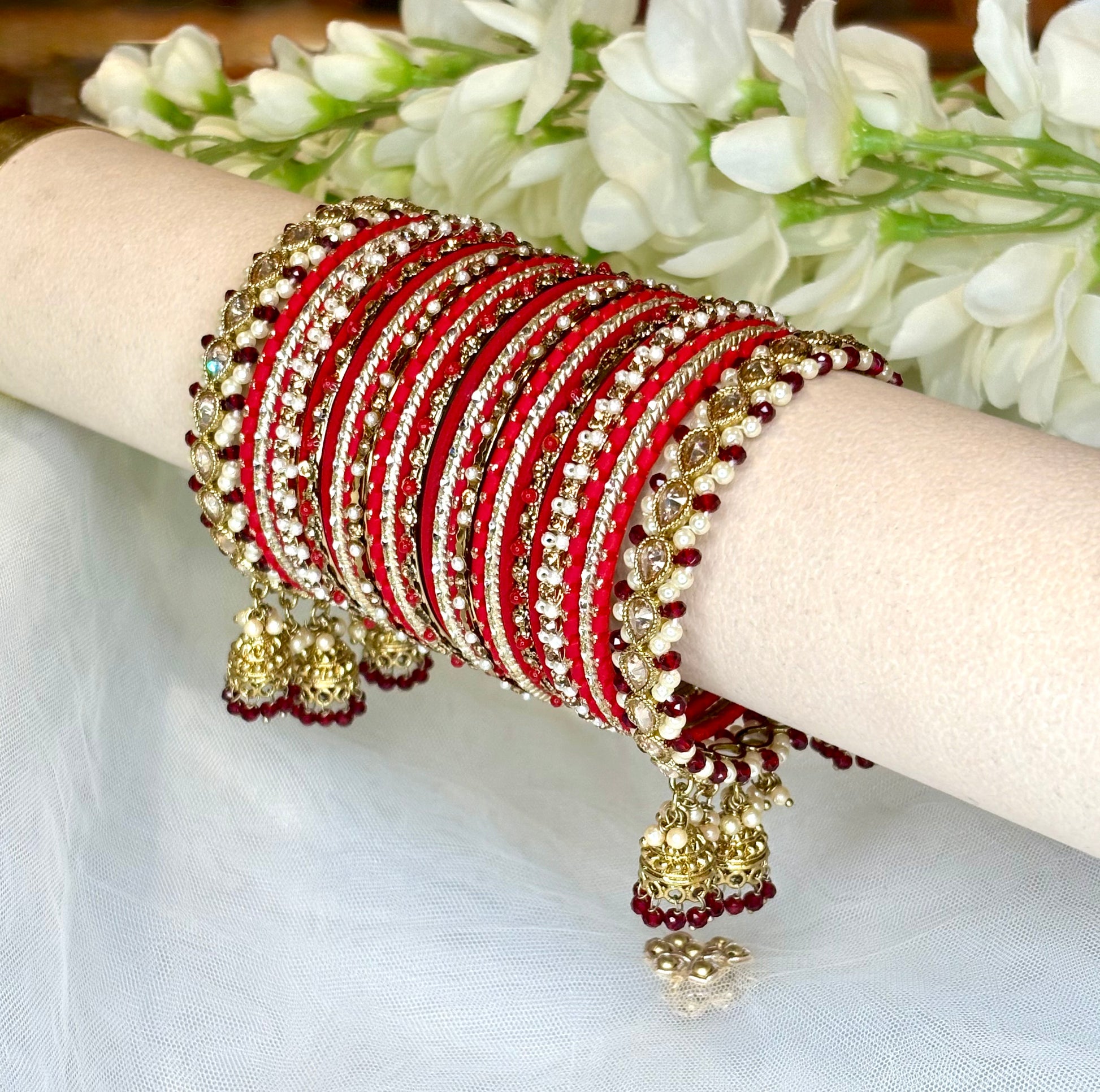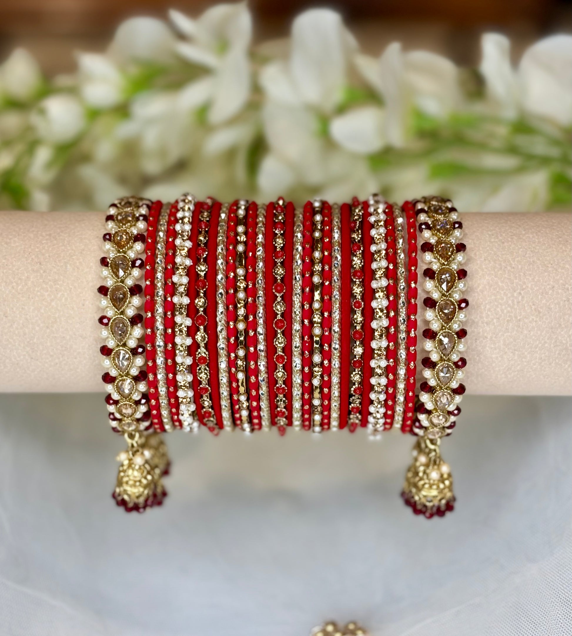 A bold red bangle stack with gold and pearl tear drop jhumkis for both arms— this beautiful non-bridal bangle set for both arms is perfect for your next event with glam and sparkle.