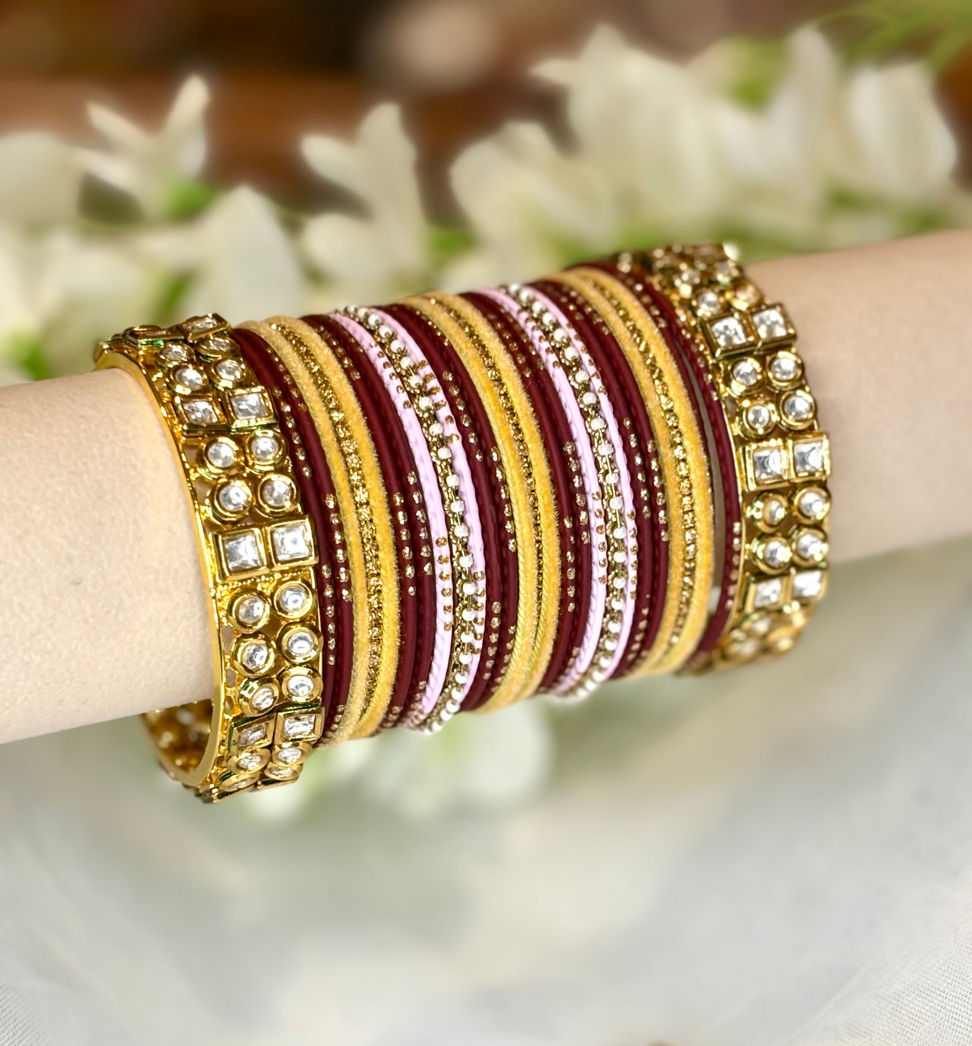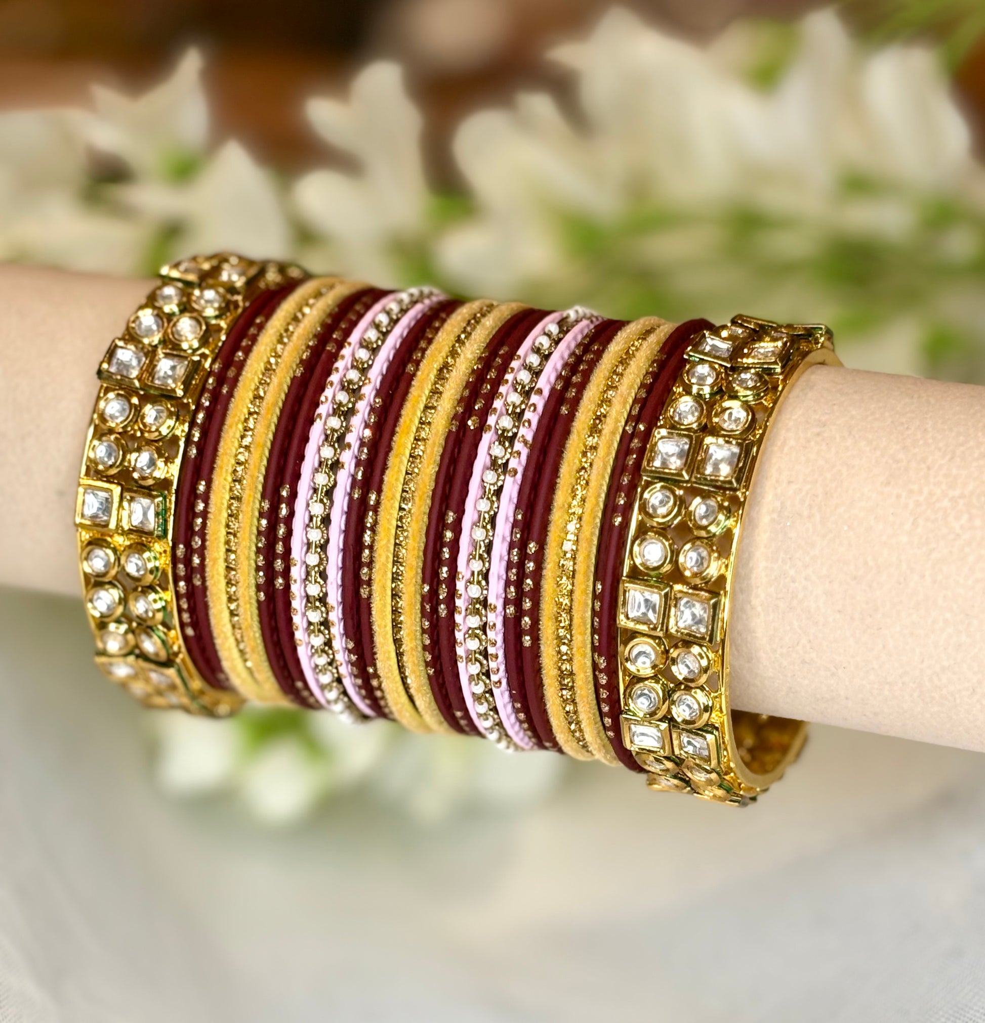 A rich maroon and gold bangle stack with kundan-style kadas—regal, modern, and timeless. This non-bridal set for both arms will be perfect for your next event.