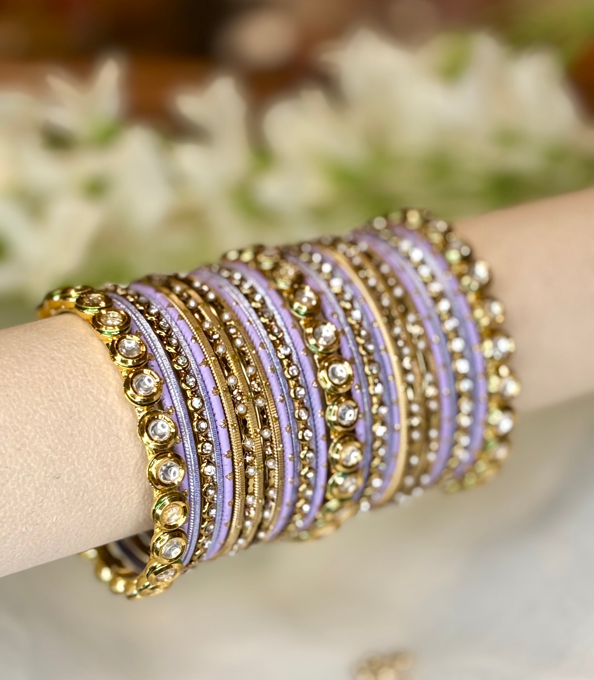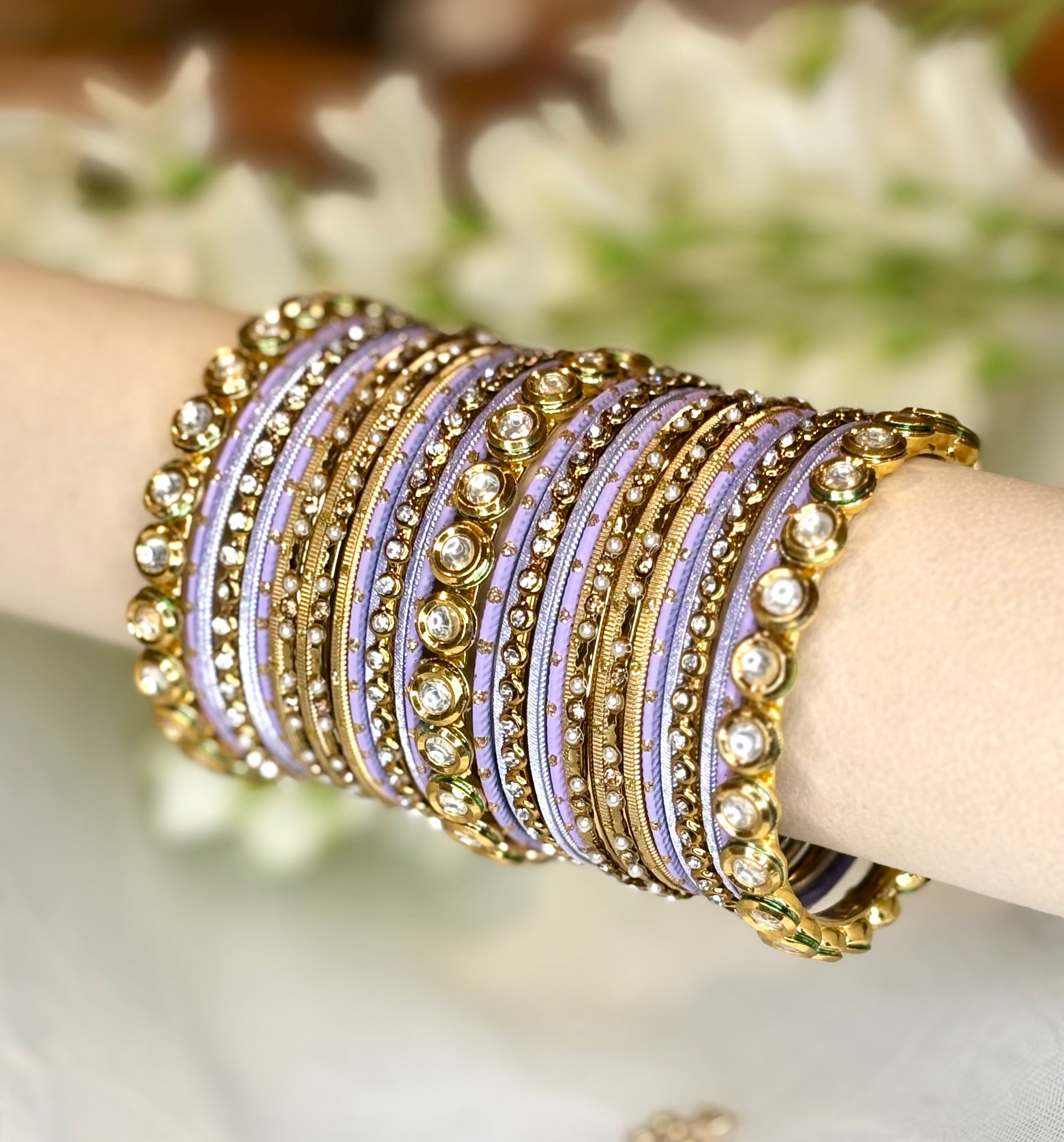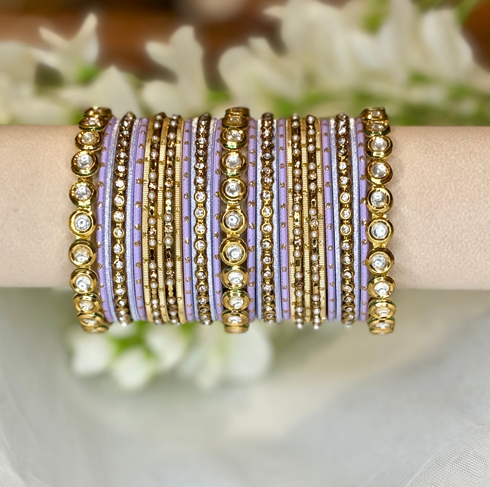 A soft and romantic lavender bangle stack paired with shimmering gold kundan bangles. Feminine, modern, and effortlessly elegant. This non bridal bangle set is for both arms