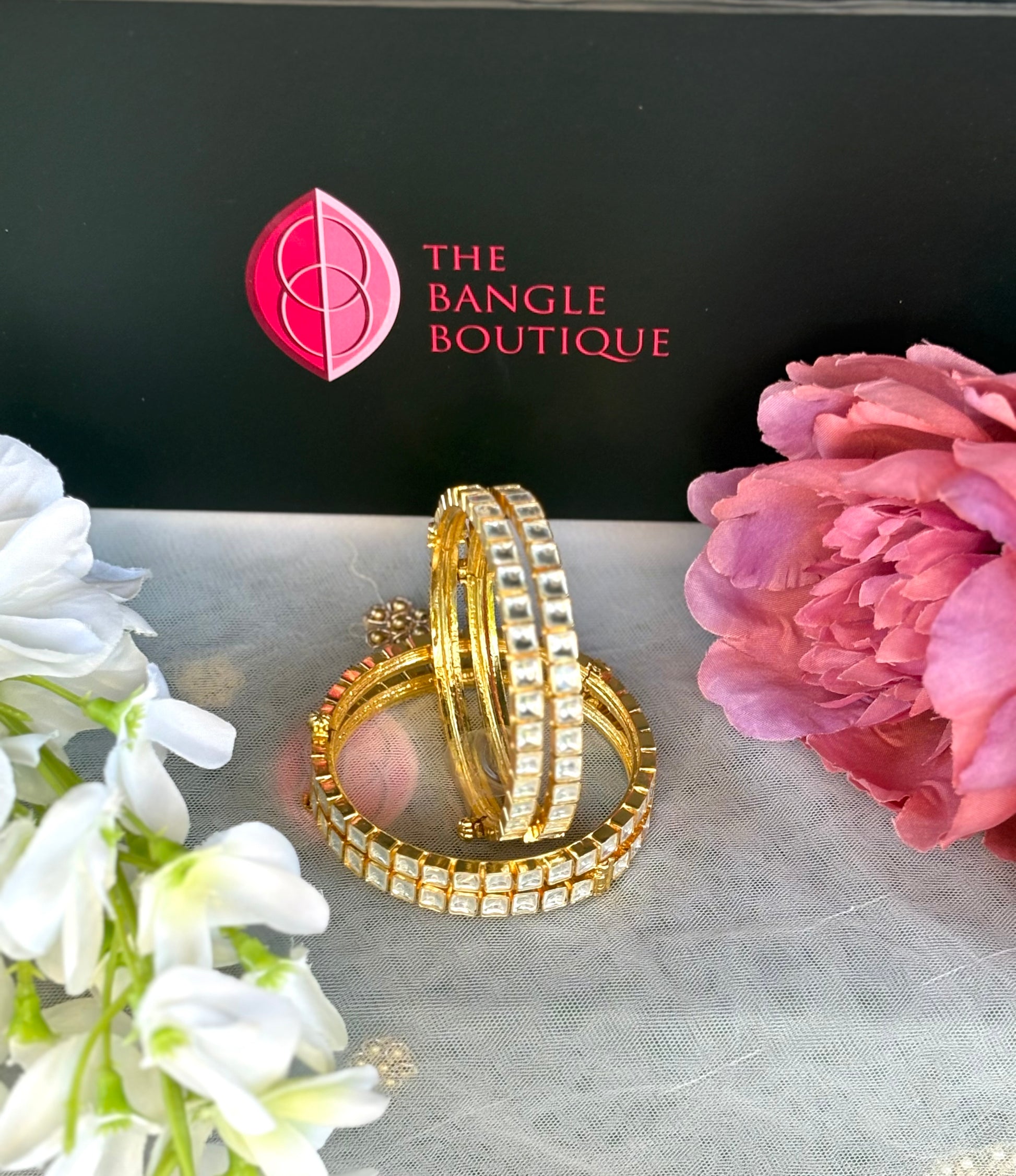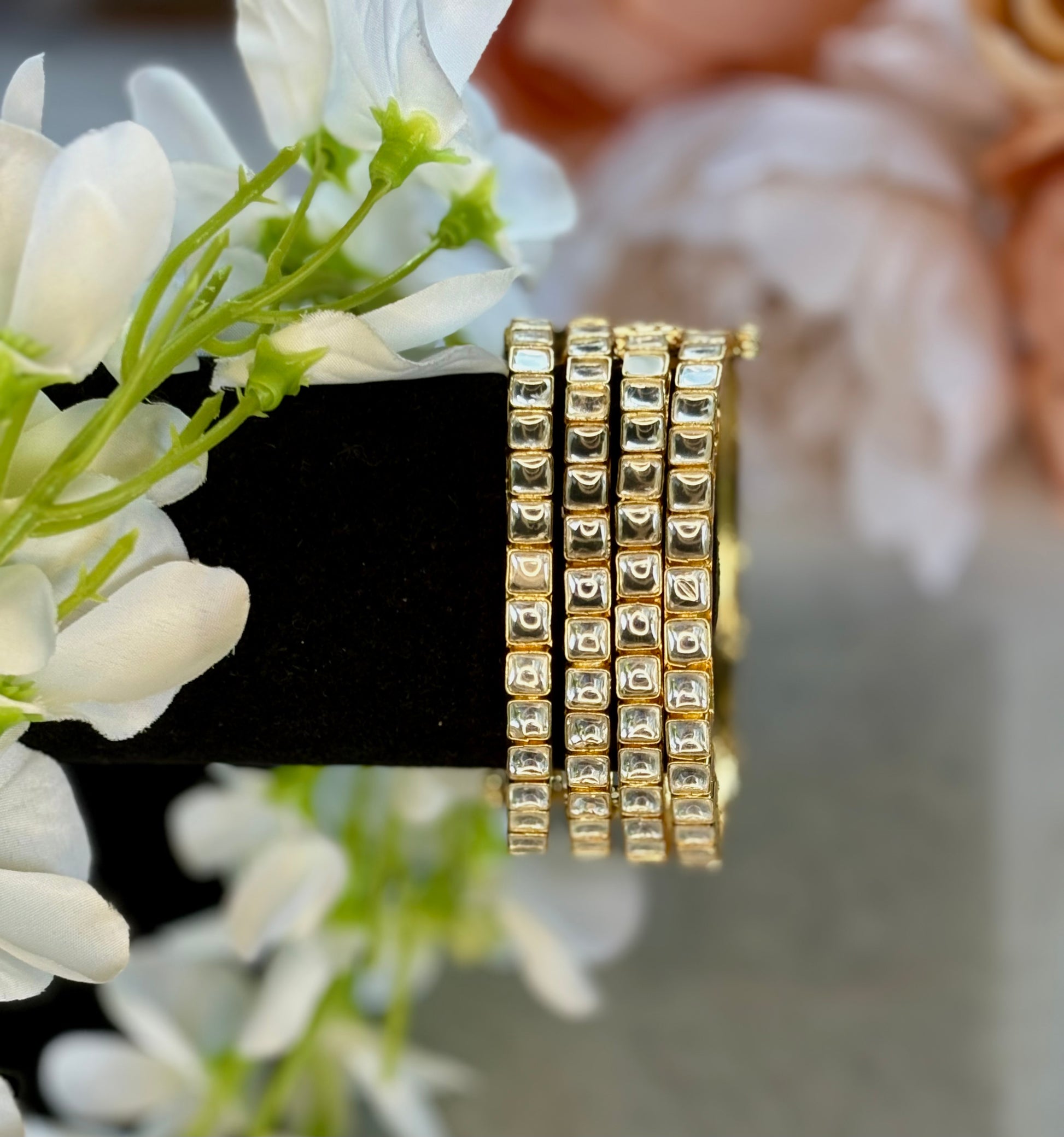 Set of 4 square-shaped kundan bangles, designed with a secure screw enclosure for easy wear. A bold twist on a classic style, perfect for any outfit