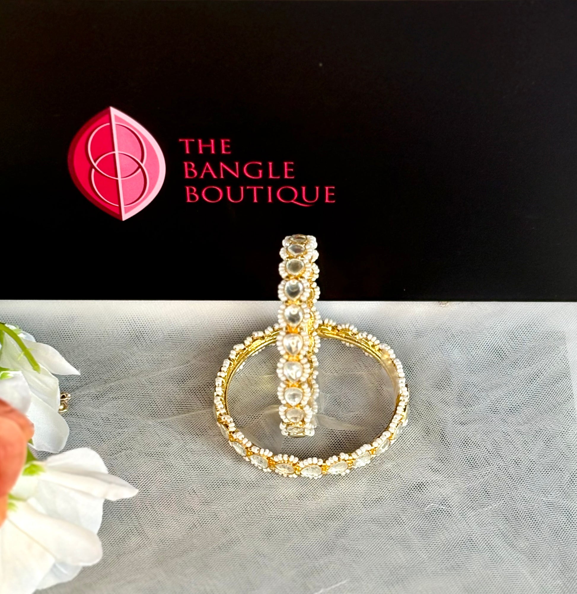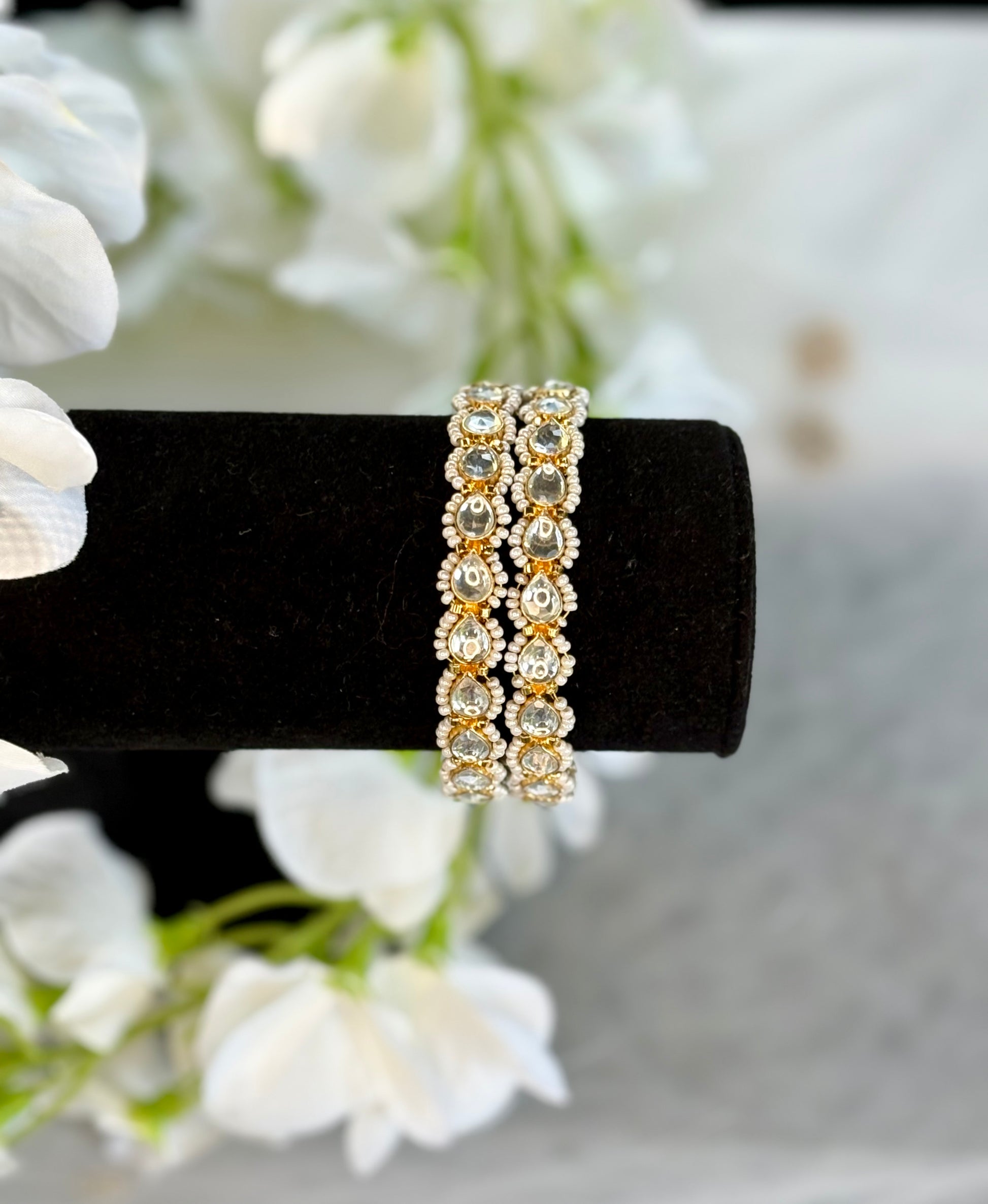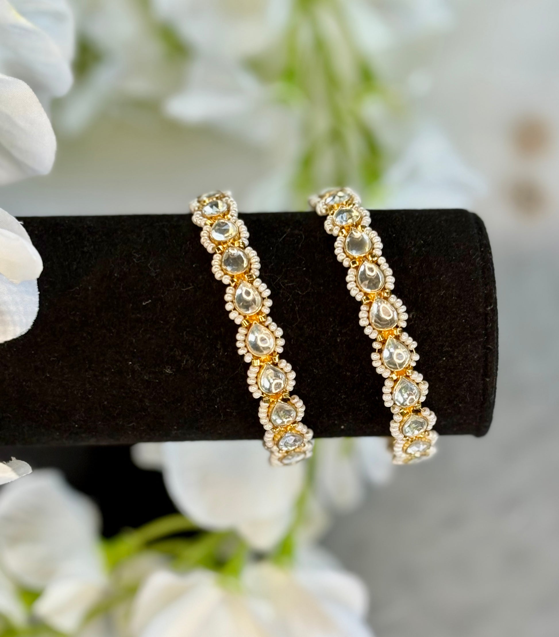 Delicate pearls surrounding tear drop kundan. These beautiful bangles can be worn alone or in a bangle stack or choora